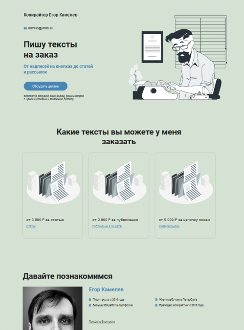 На этом же экране можно сразу показать и портрет копирайтера. Однако, если у автора нет профессионального кадра, лучше не портить первое впечатление посетителя фотографией с низким разрешением и с плохого ракурса.
